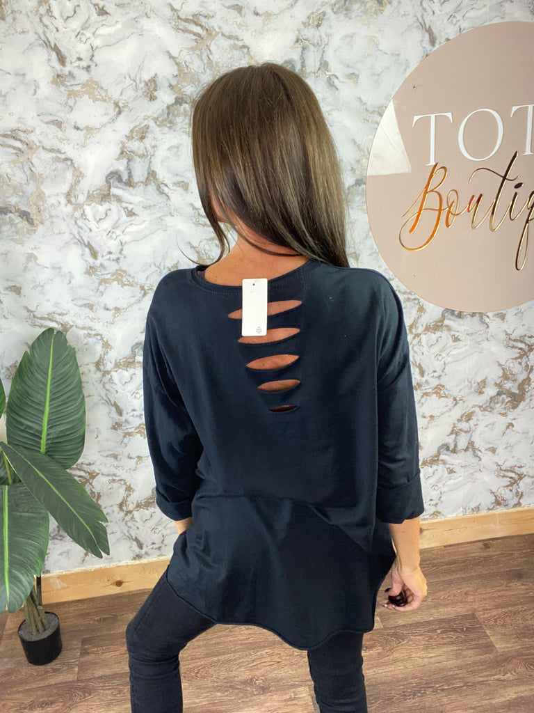 long sleeved 100% cotton jersey style top with slash back detail and diamanté