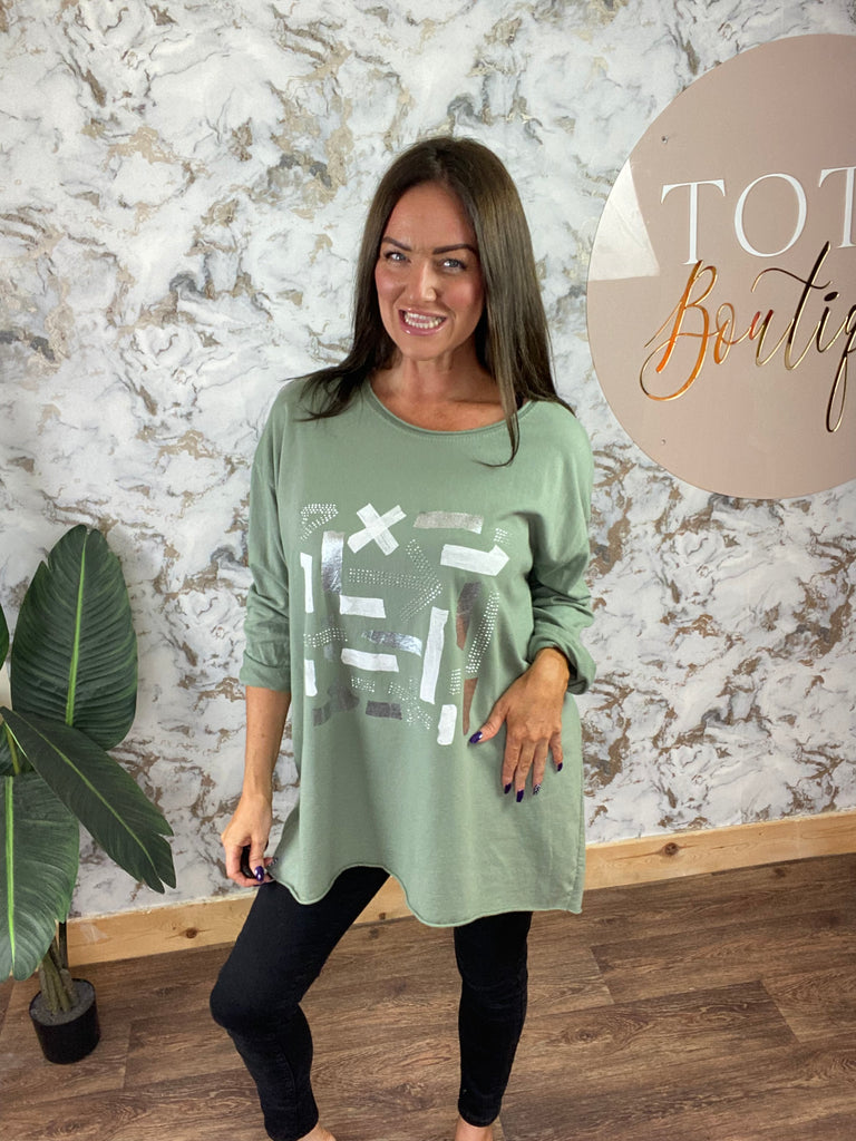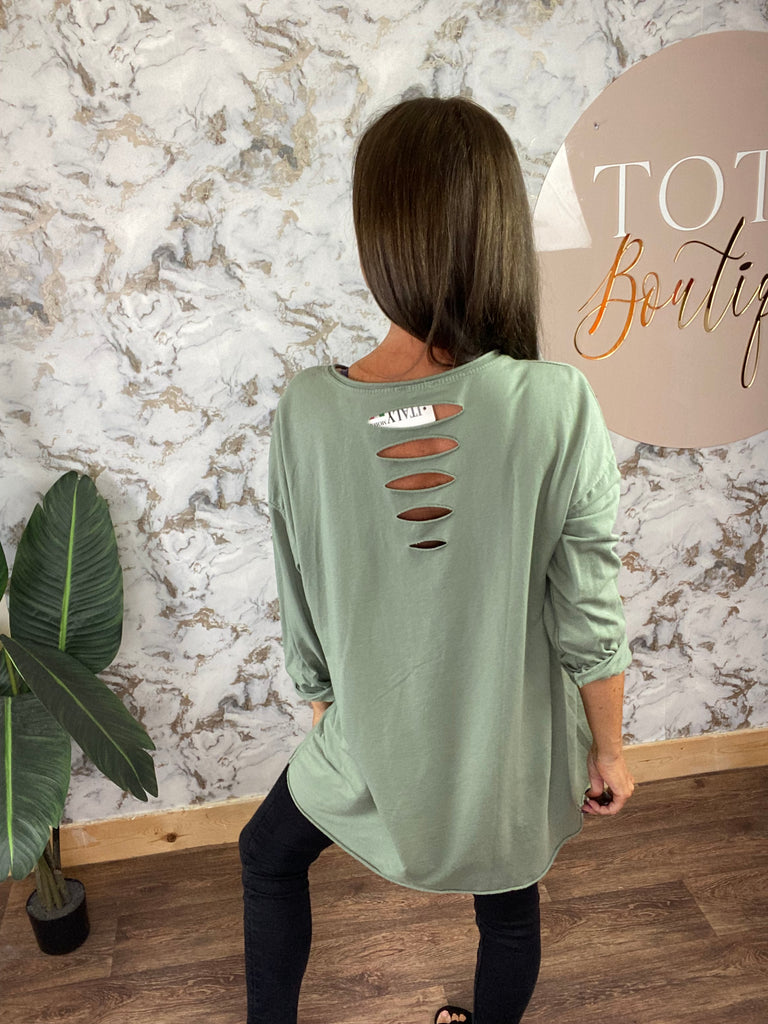 long sleeved 100% cotton jersey style top with slash back detail and diamanté