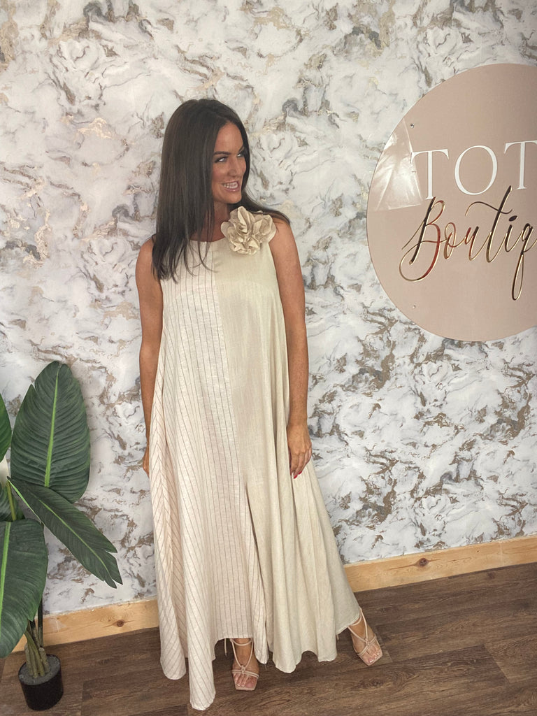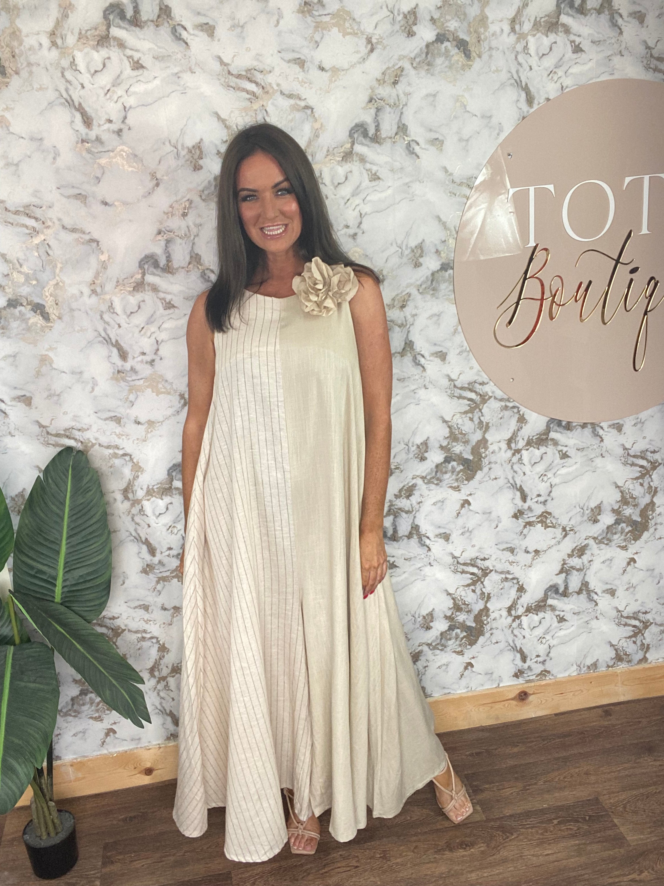 zip back jumpsuit with wide leg, removable flower pop broach