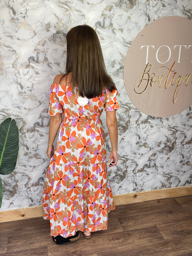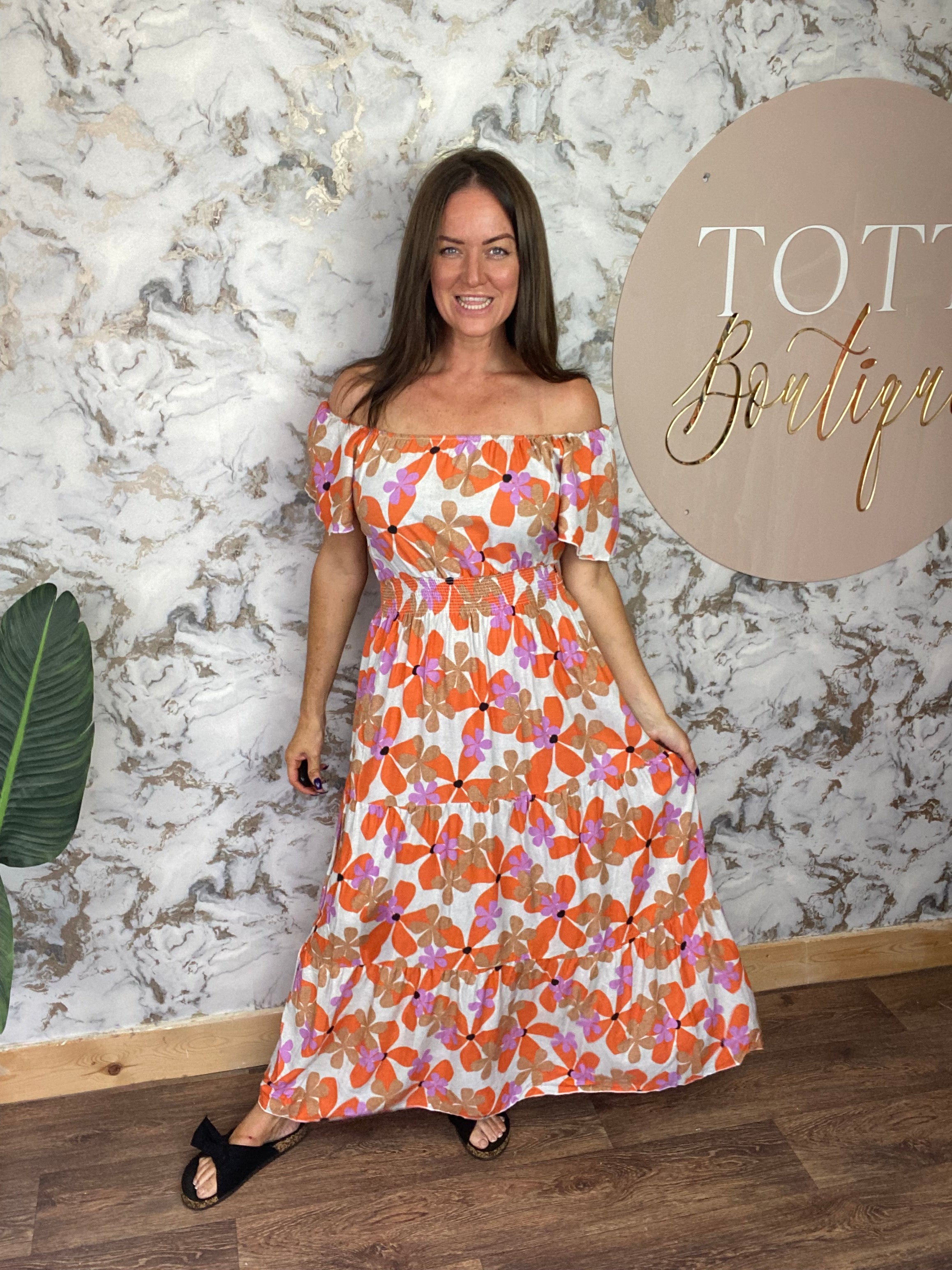 Floral Bardot maxi dress - lilac/orange is backordered. It will be shipped when back in stock.